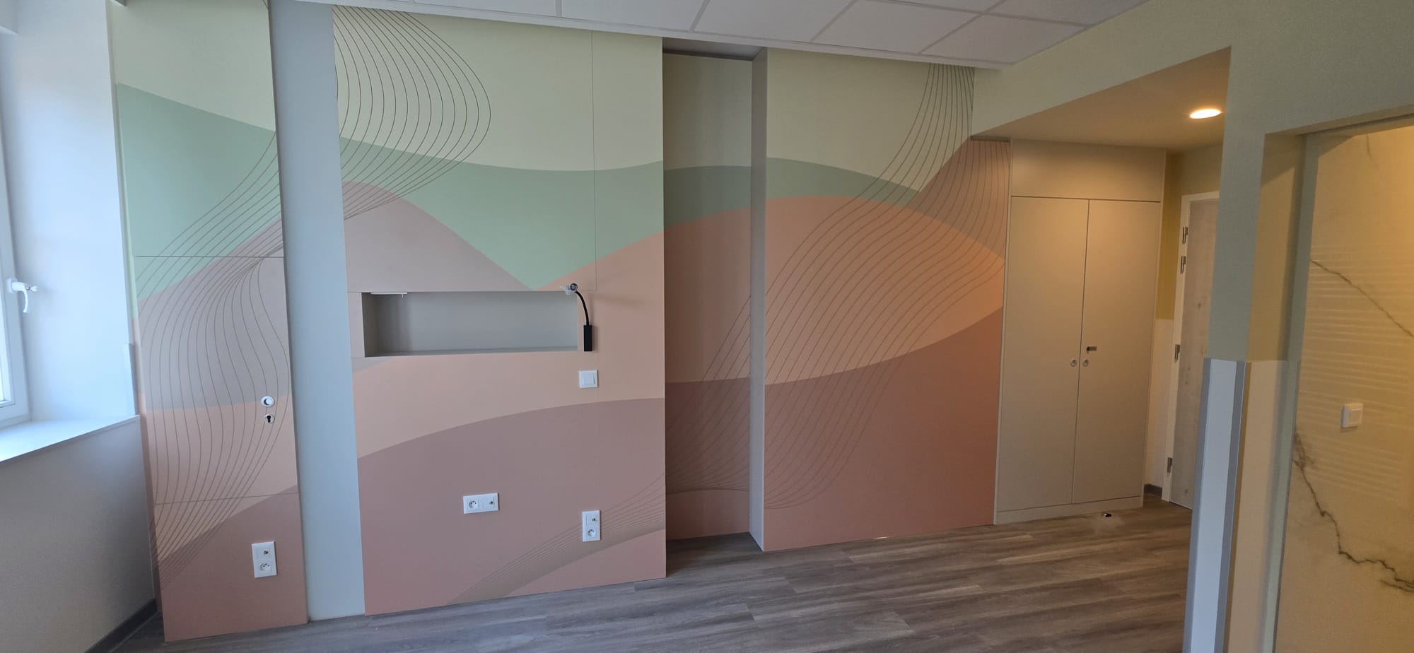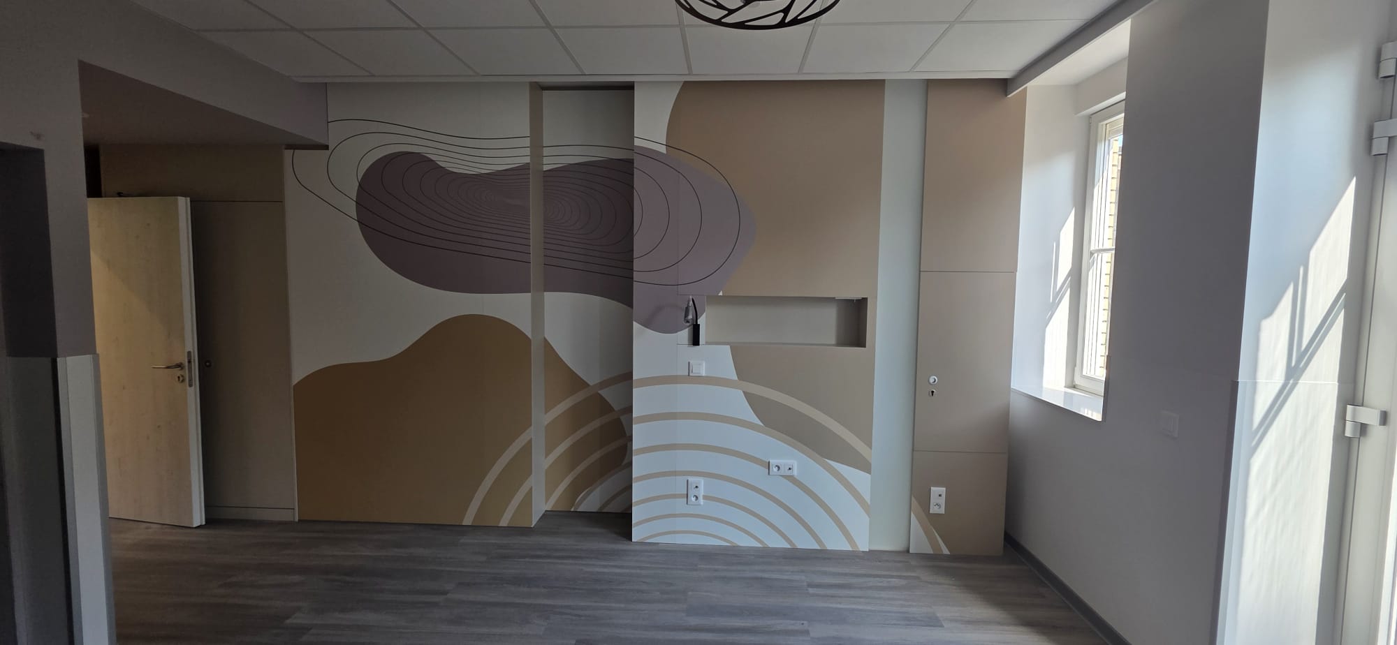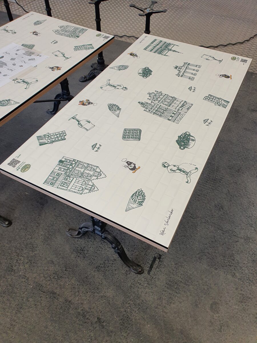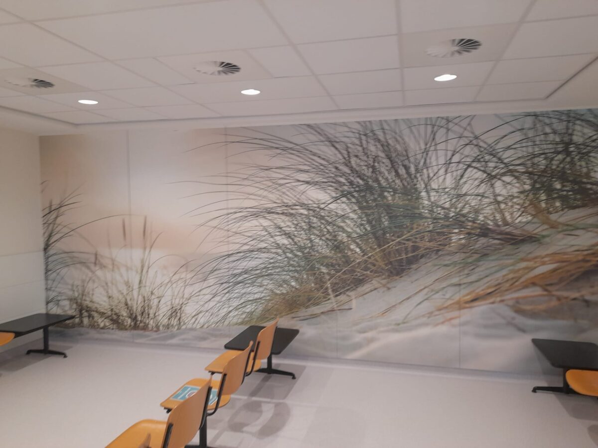 Chez Brion & Charlot, nous avons utilisé cette solution notamment au CHU Bouge, dans le cadre de l’aménagement d’une salle d’attente, pour l’enseigne Léon, avec personnalisation de tables en stratifié massif, ainsi que pour l’asbl Les Sentiers de Grande randonnée. Ce procédé d’impression sur panneaux stratifié est également exploité par le CHU Brugmann dans le cadre de l’aménagement de chambres destinées aux soins palliatifs afin de créer une atmosphère apaisante et moins austère que celle que l’on peut retrouver dans des chambres hospitalières traditionnelles.