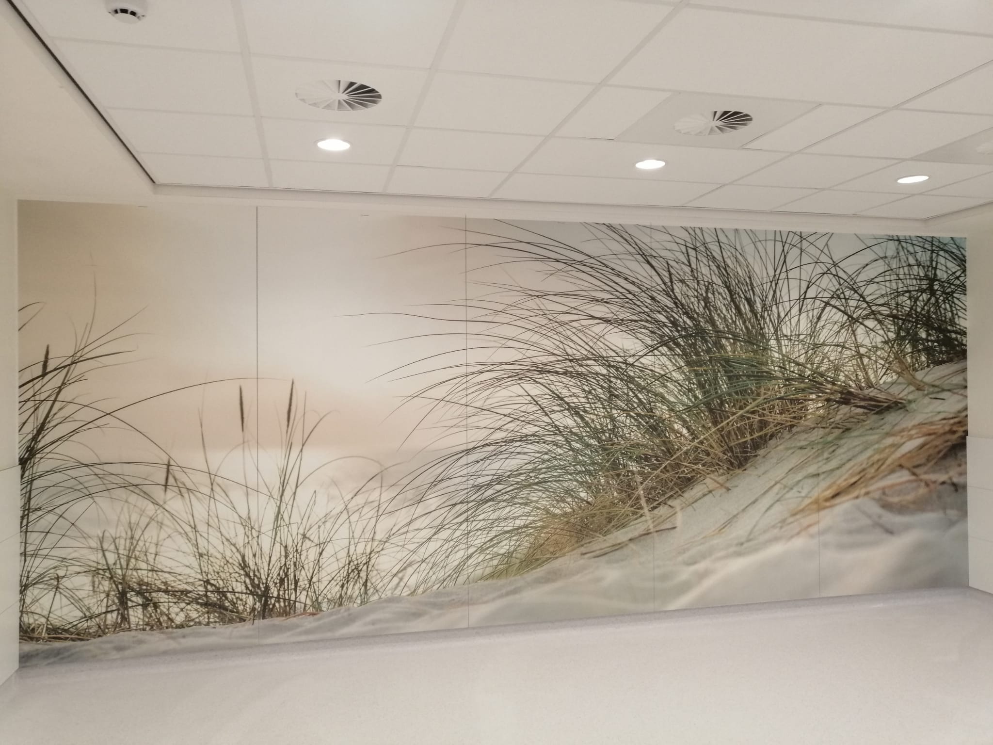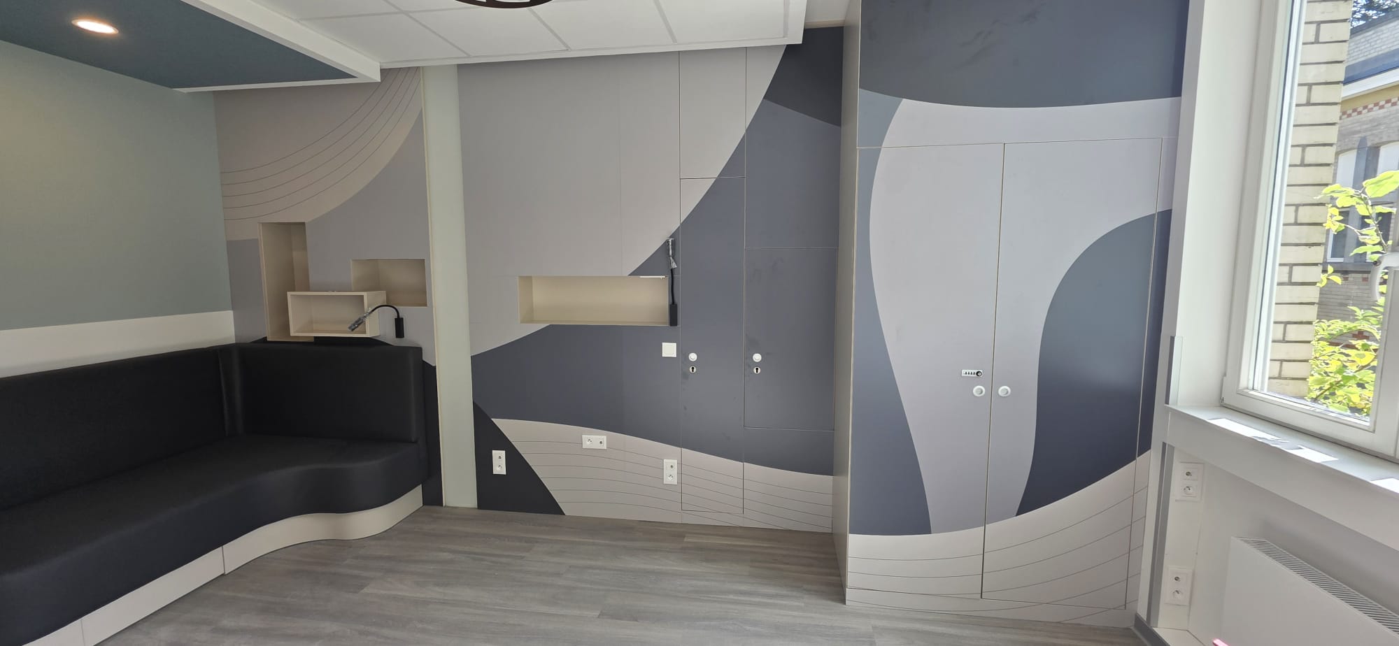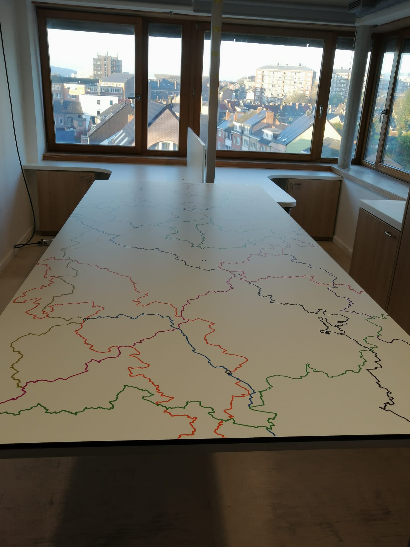Chez Brion & Charlot, nous avons utilisé cette solution notamment au CHU Bouge, dans le cadre de l’aménagement d’une salle d’attente, pour l’enseigne Léon, avec personnalisation de tables en stratifié massif, ainsi que pour l’asbl Les Sentiers de Grande randonnée. Ce procédé d’impression sur panneaux stratifié est également exploité par le CHU Brugmann dans le cadre de l’aménagement de chambres destinées aux soins palliatifs afin de créer une atmosphère apaisante et moins austère que celle que l’on peut retrouver dans des chambres hospitalières traditionnelles.