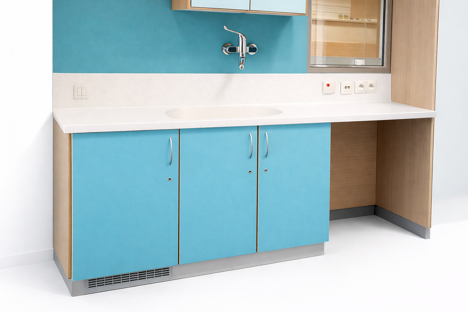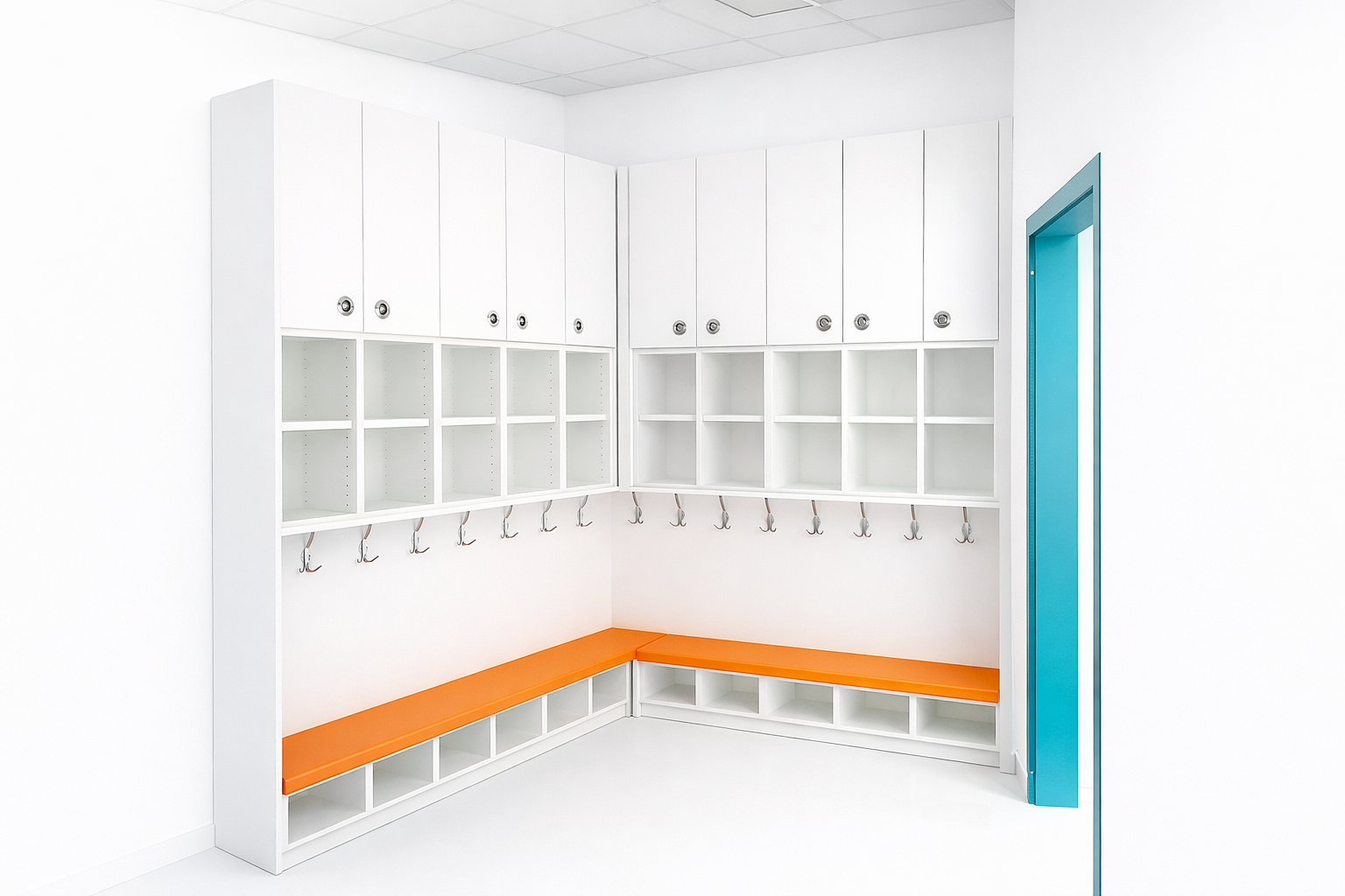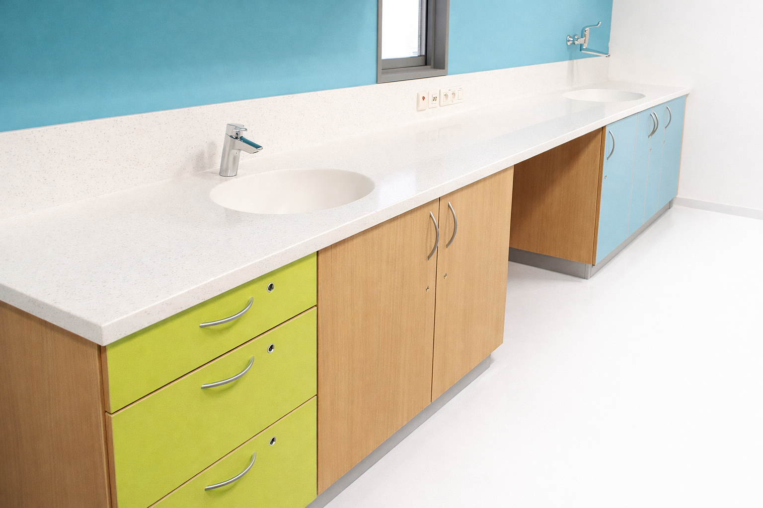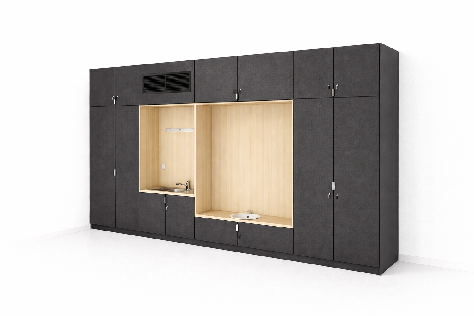Agencement vestiaire – Plan vasque en solid surface et cabine douche en stratifié massif
